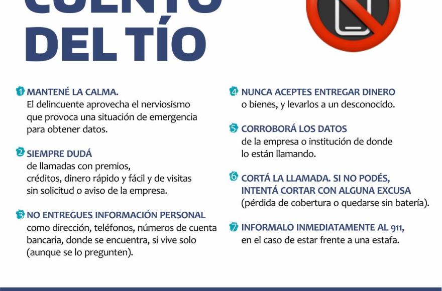 Entre ellas se destaca el tema de no dar códigos, números de tarjeta o información personal a ningún tipo de llamado que provenga de desconocidos y, por sobre todas las cosas, de los famosos "cuentos del tío" con los cuales muchos han de sufrir pérdidas económicas.