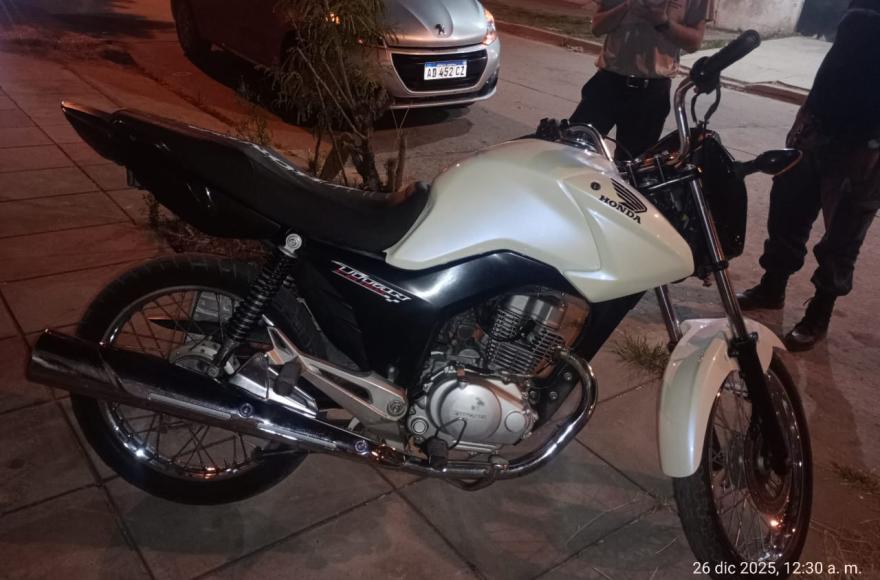 Previamente, a las 00:27 horas, en la esquina de Belmartino y Reconquista, se retuvo una motocicleta Honda Titán. El conductor de la misma protagonizó un intento de fuga al advertir el control. Una vez detenido, se verificó la falta total de documentación (sin seguro, sin licencia y sin cédula) y se observó que el vehículo circulaba con el dominio (patente) mal colocado, dificultando su identificación.