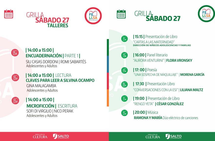 Se dio a conocer el cronograma de actividades para la Feria del Libro de Salto (FE.LI.SA), que se realizará este fin de semana en la Unidad Académica José de San Martín. Por el momento, se detallaron las propuestas para el día sábado 27, que comenzarán a las 14 horas con conversatorios, charlas y talleres.